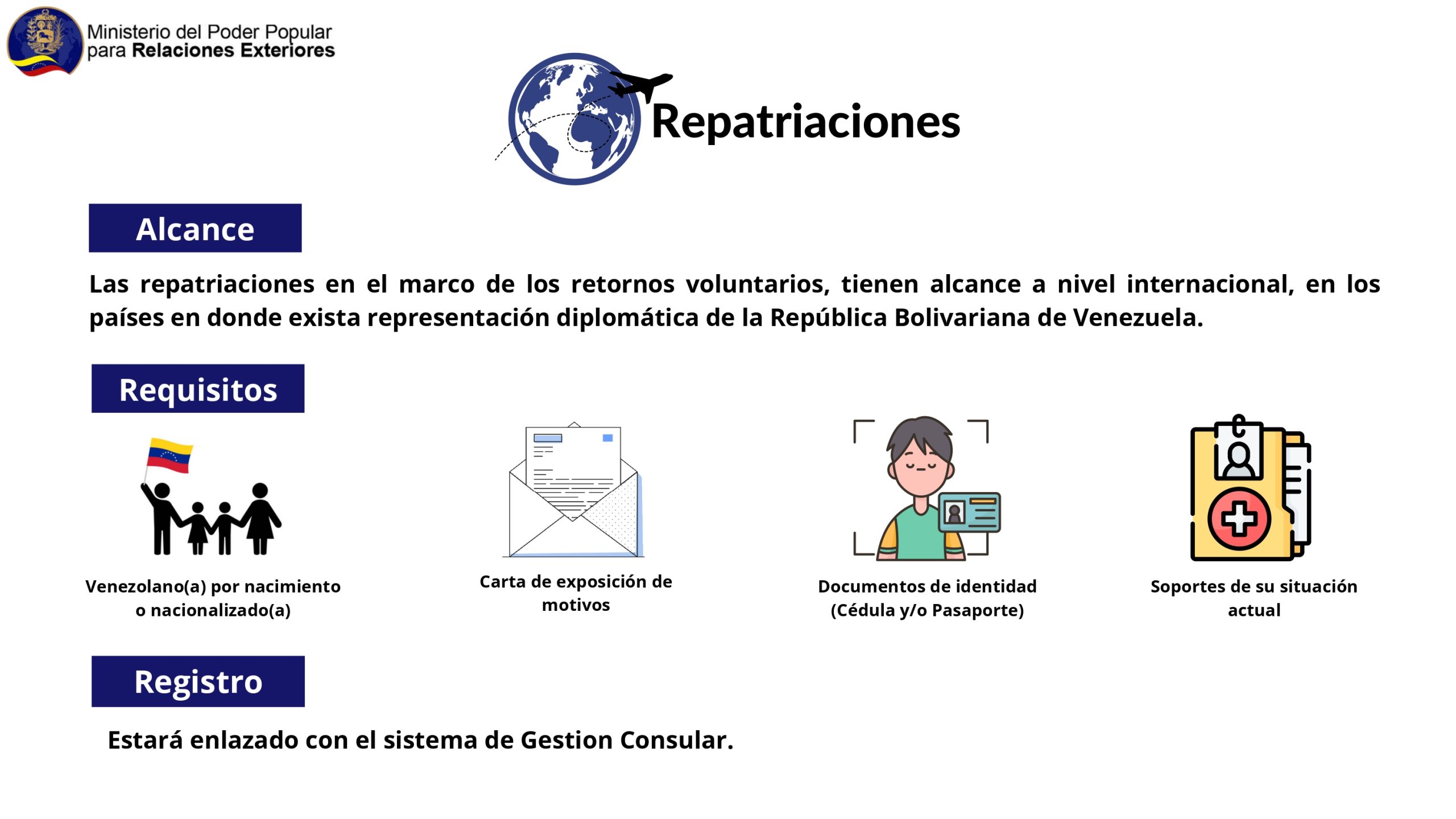 Las repatriaciones, en el marco de los retornos voluntarios, tienen alcance a nivel internacional, en los países en donde exista representación diplomática de la República Bolivariana de Venezuela.
